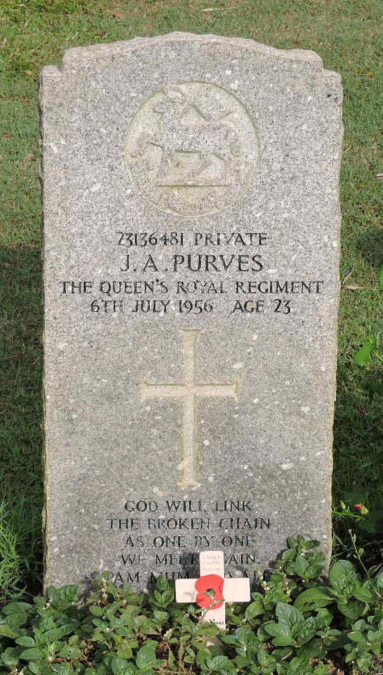 One CT fell but appeared to be about to throw a grenade so was dealt with by Private Cooper. The patrol continued to advance firing at intervals, and had killed three more CTs when there was a shout that Private J A Purves had been hit. He and Private Millhouse had pursued and shot a fifth CT, who in falling had shot Purves who later died. By resolute and skilful action this small patrol had killed five CTs, but its success was shadowed by the loss of Purves, who was buried with full Military Honours in Singapore the next day. Sergeant Isaac was awarded the Military Medal.