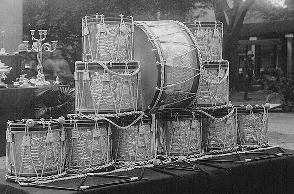 | The Silver Drums on display in Murray Barracks, 1926 (Click image to enlarge) |