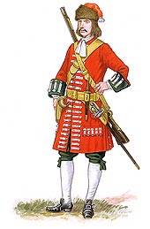 | A Grenadier, his flintlock with a wide leather sling only carried by grenadiers at this date. |