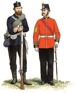 Home Service Dress was worn in New Zealand. The blue serge frock was worn for campaigning in the Colony, which was much because of a shortage of red cloth, as for any tactical reason. The fighting conditions were harsh and often the troops had to wade through swamp water up to their knees with their trousers in rags. In 1862, flank companies had been abolished in the Army, though whilst abroad the distinct bugle horn and grenade badges were still often worn on forage caps.