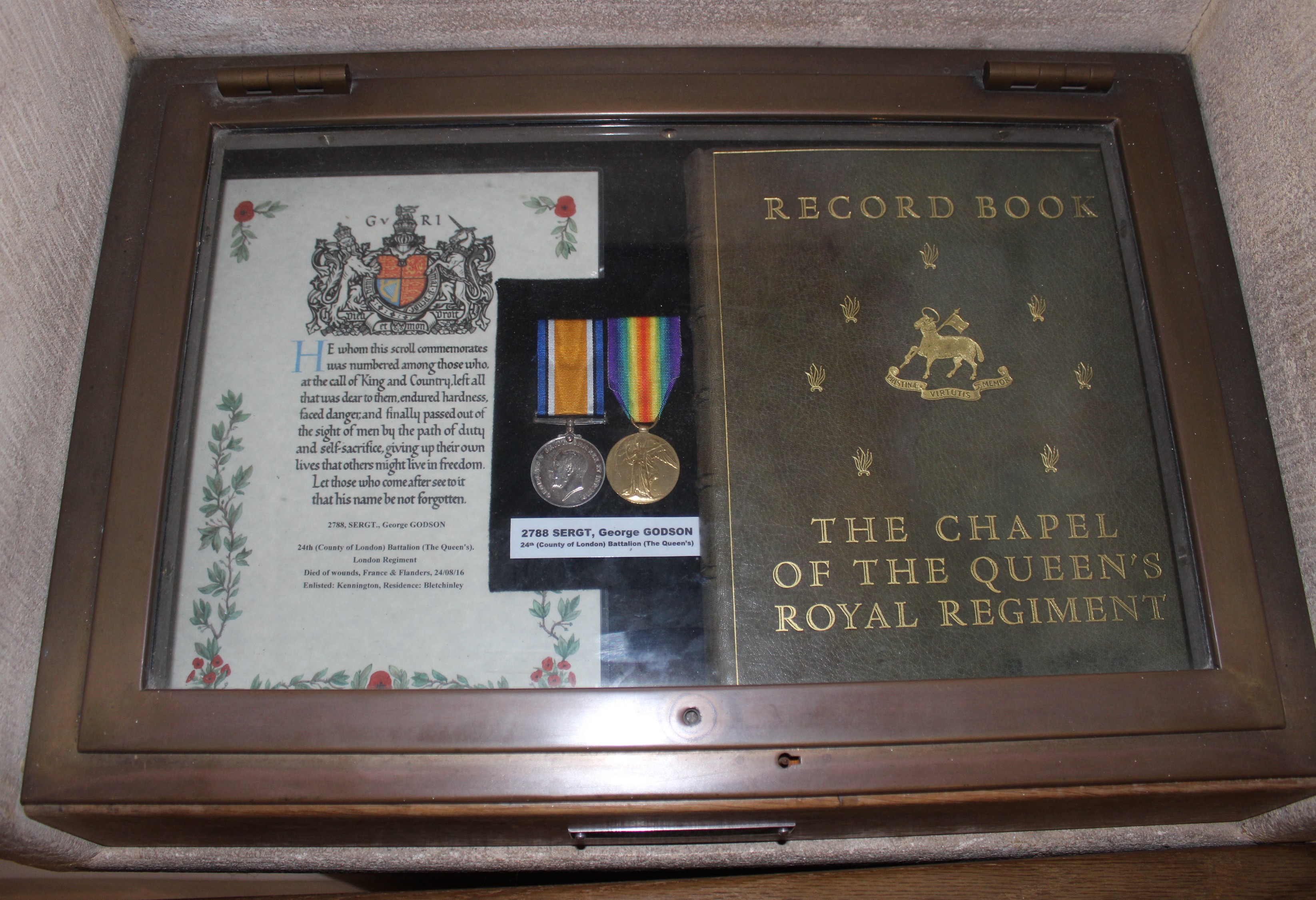 The Medals on display beside the Record Book were the gift of the following ladies, Mrs D Walton, Mrs KI Smart, Miss ME Godson and Miss WE Godson in memory of their 20-year-old brother, Sergeant George Stuart Godson, who served with the 2nd/24th Battalion The London Regiment (Queen's) who died of wounds on 24th August 1916