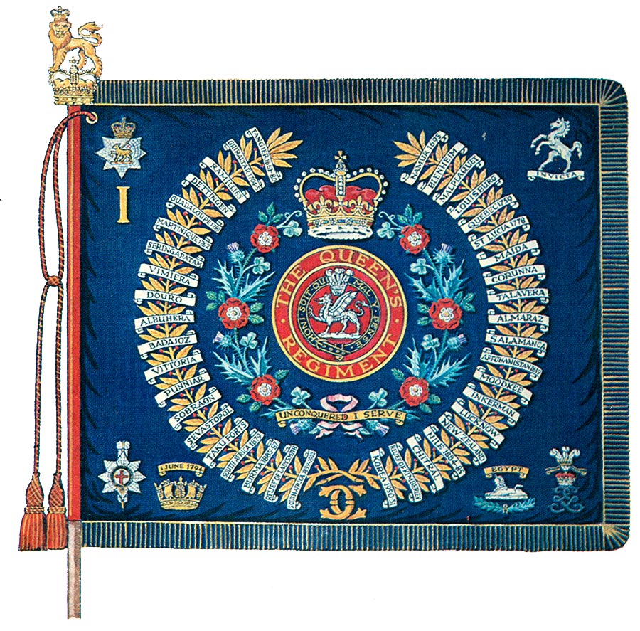 The Queen’s Colour of the 1st Battalion was the same in form as the old Queen’s Surrey one except that the title roundel now reads “The Queen’s Regiment”, and the forty Battle Honours contained many not previously seen. A list of these may be found in Soldiers of the Queen by JP Riley. The Regimental Colour was again blue, with the battalion numeral in the first canton. The four corner badges were now the badges of the four Home Counties regiments in order of seniority, while the Naval Crown and the Sphinx returned to their accustomed places at lower left and right of the Colour. In the centre was again the Garter within a red roundel bearing the regimental title. However, the cipher was replaced by a Dragon and Prince of Wales’s feathers. The cipher moved to a position at bottom centre of the Colour between the two distinctions. The motto on the Union wreath was now Unconquered I Serve, while the laurel wreath bore many new Battle Honours which may be found in Soldiers of the Queen. These Colours are shown as figures 75 and 76.