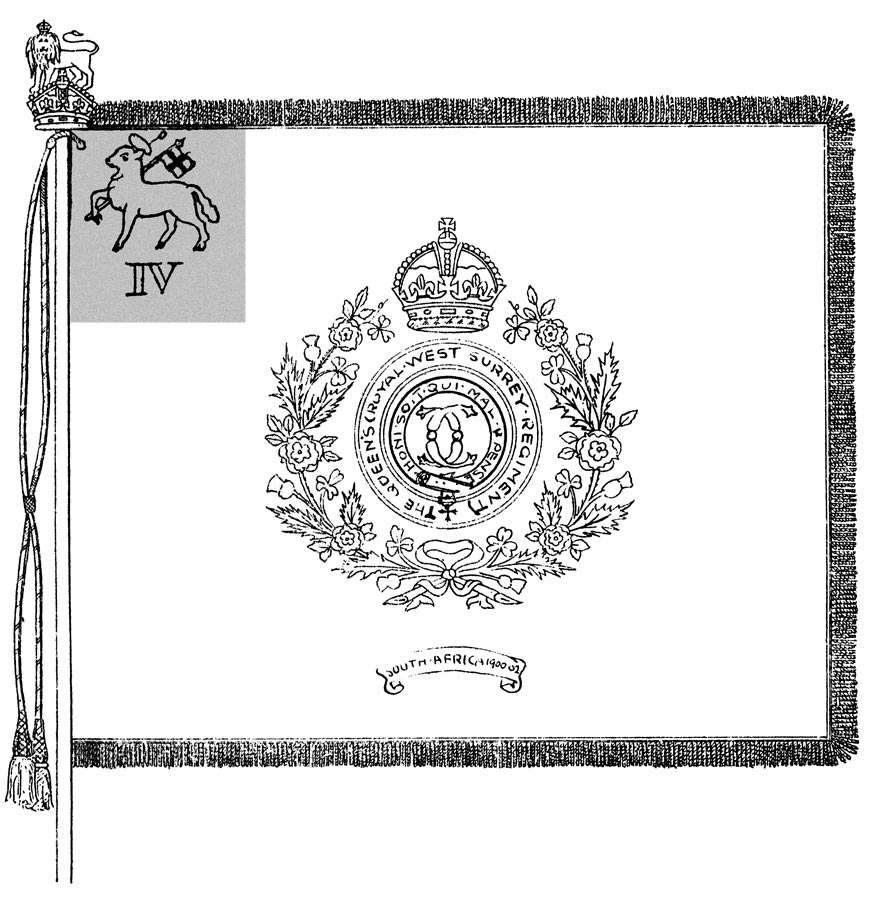 On the formation of the Territorial Force in 1909, the 1st Volunteer Battalion of The Queen’s became the 4th Battalion (TF) and as such became eligible to display Colours. In fact this battalion was the very first TF unit to be granted permission to carry Colours. Because of this there was a good deal of discussion over design and it is from these Colours that one can trace the direct descent of those Colours afterwards carried by the Regular and Territorial Battalions of the Regiment.