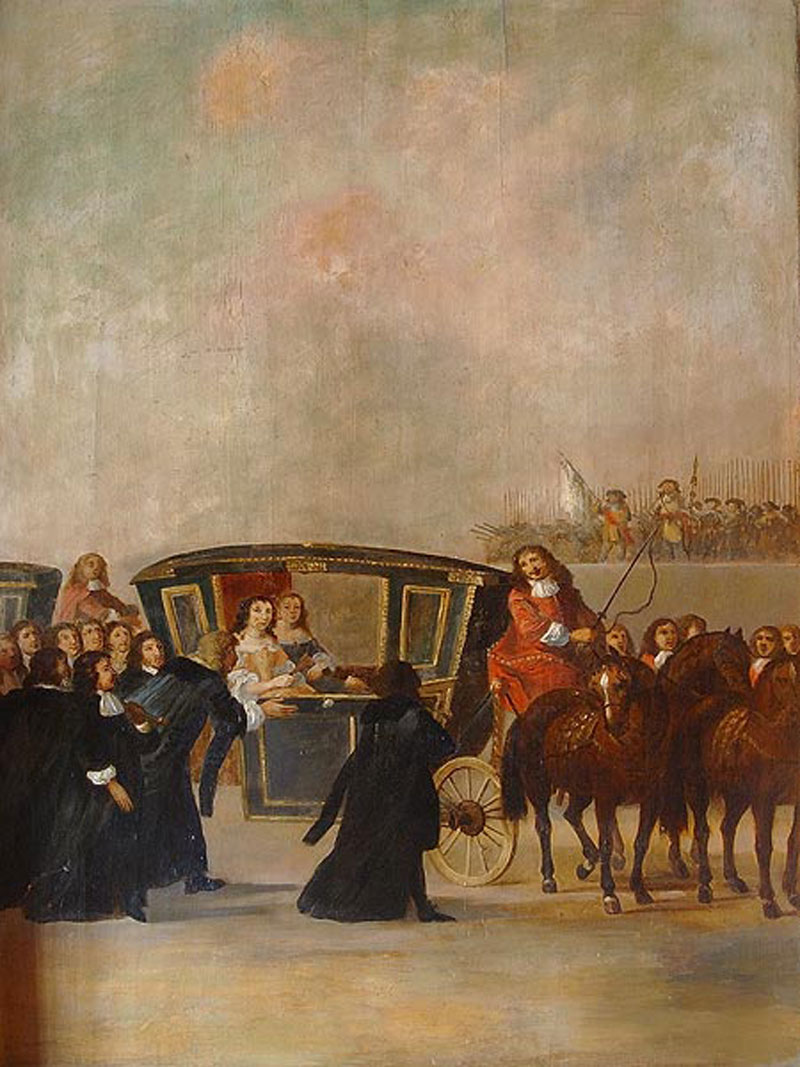In 1839, in a house occupied by a Mr. Stanley in Harnet Street, the series of panels was discovered hidden behind the plaster. They are attributed to William Van der Velde, the Dutch painter, who is known to have been in Sandwich about the time of their probable execution. They were given to Lady Ashburnham and sold at her death to Admiral Jolliffe, whose widow removed them to London. After an absence of nearly 30 years, she returned them to Sandwich, presenting them to the Corporation. This valuable gift was largely due to the efforts of Alderman W.J. Hughes to recover them for the town. Four panels represent the entry of Catherine of Braganza into Sandwich in 1672. According to the historian Boys, "Queen Catherine came to Sandwich on the 4th May with a great train, and there was a royal banquet provided for Her Sacred Majesty and attendents at the Mayor's door, for the Queen would not quit her coach". The reason for the Queen's refusal to leave her coach was because she did not wish to walk in the "Dirty Streets of Sandwich", a statement still remembered by the people of the Town, this despite the banquet laid on at the Bell Hotel in her honour. It is also of some interest to know that in attendance on the Queen on that occasion was James, Duke of York, Lord Warden of the Cinque Ports, later King James II.